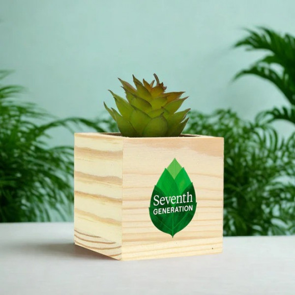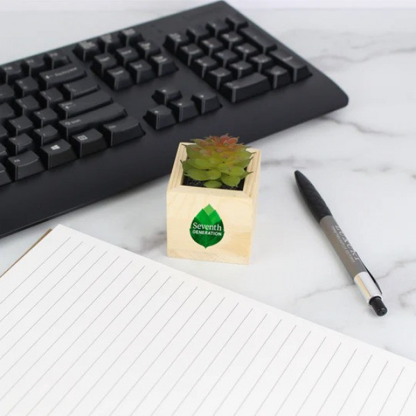 Add a touch of greenery to any space with this Wooden Planter with Artificial Succulent, a stylish and sustainable promotional product that can be custom branded with your logo. Crafted from natural pine wood, this minimalist planter features a realistic, maintenance-free succulent that brings calm and freshness to any environment no sunlight or watering required. Each purchase makes a positive environmental impact by contributing to tree-planting efforts across North America.