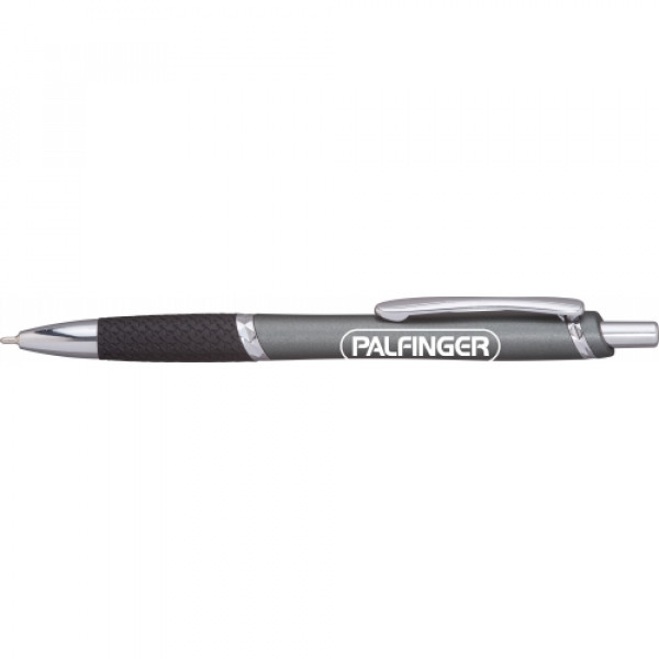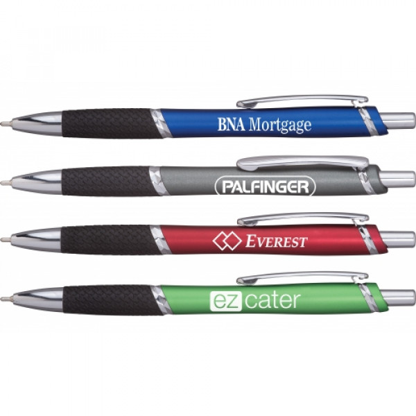 Add a pop of personality to your next promotion with this stylish and eye-catching pen. Featuring diamond-cut silver bands, shimmering barrel colors, and a unique houndstooth textured grip, it offers a high-end look at an accessible price point. This pen is the perfect customizable promotional product to showcase your brand with flair and function.