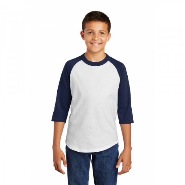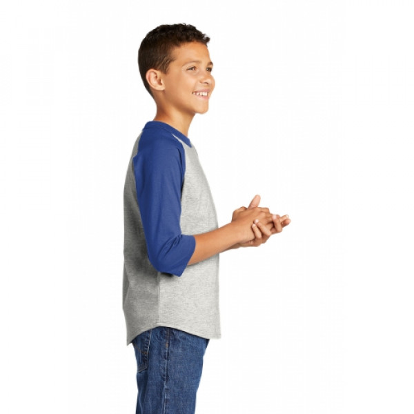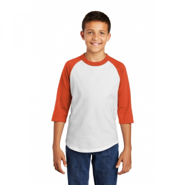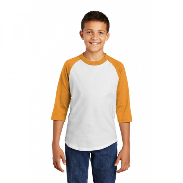 This classic knit jersey is combed for softness and available in several team colors. | 5.3-ounce 100% ring spun combed cotton Colorblock sleeves and rib knit crewneck 3/4 raglan sleeves