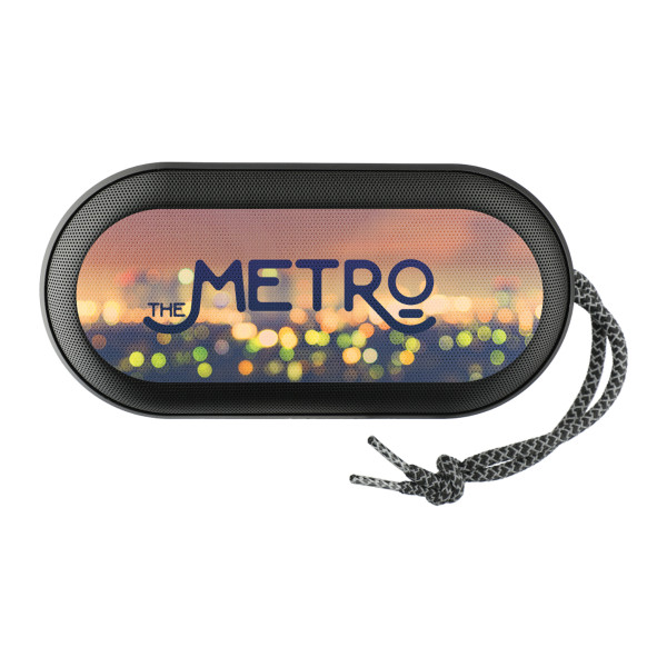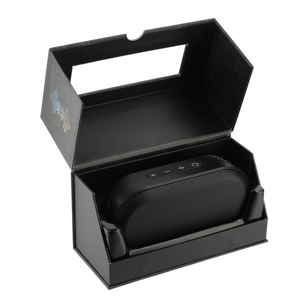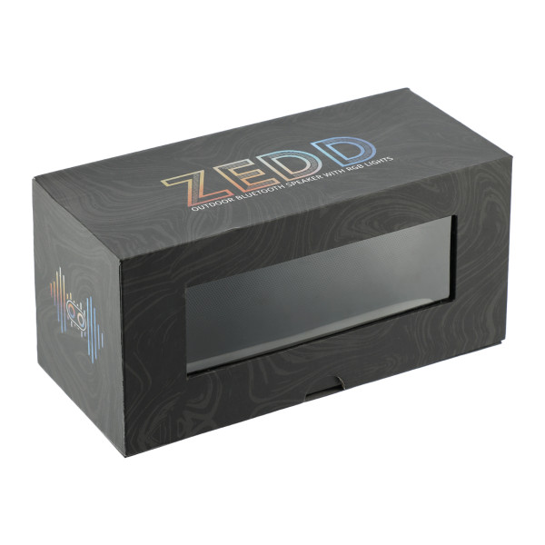 The Zedd has an IPx6 Waterproof rating, meaning it can withstand rainstorms or splashes of water without damaging the speaker. The 5-Watt Bluetooth® speaker that will produces music that can be heard or inside or oustide. Built around the speaker drivers are RGB (Red,Green,Blue) lights that can be adjusted to your preference. The speaker features built-in music controls and a microphone. A 50cm USB-A-to-Type-C charging cable is included. Playback time at max volume: Up to 7.5hrs. Charge time: 2.5hrs.Details