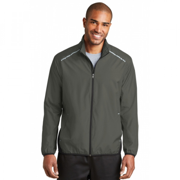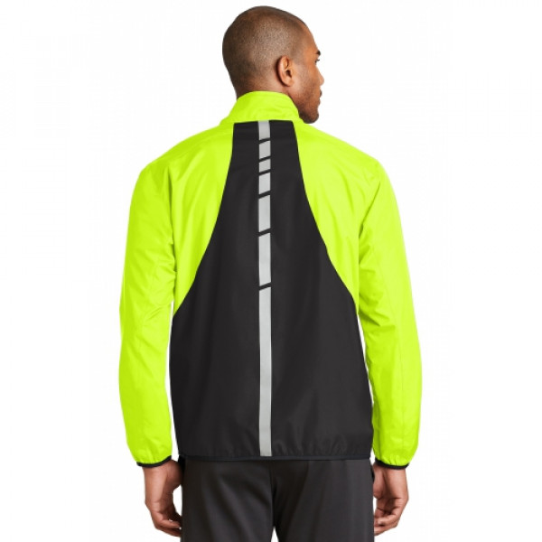 With eye-catching reflective hits and colorblocking details, this unlined jacket has a smooth hand along with wind- and water-resistance.::100% polyester shell::Interior wind flap::Open front pockets::Elastic binding at cuffs and hem::Reflective details